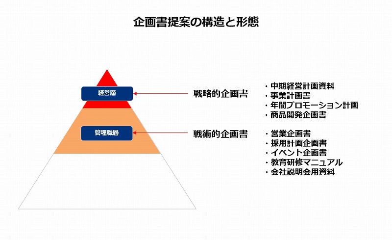 また管理職層に向けた企画書は、集客、プロモーション、採用手法、研修内容といった短期的成果が求められる現場オペレーション的な戦術的企画書になる傾向が強いです。