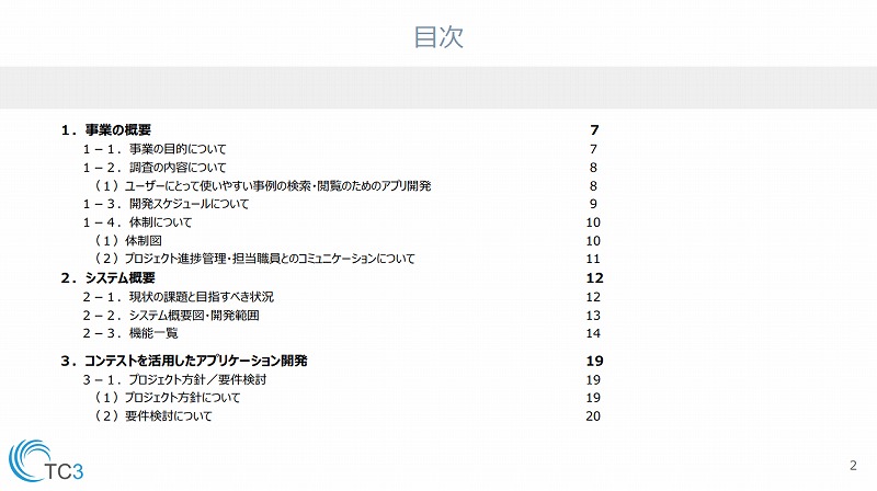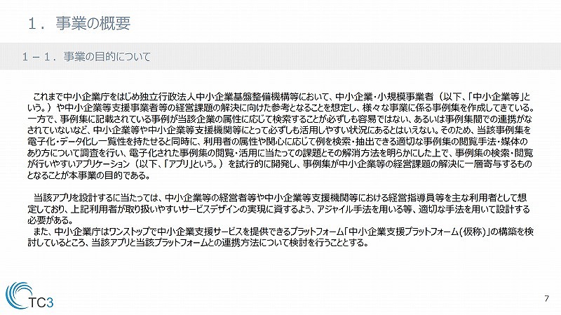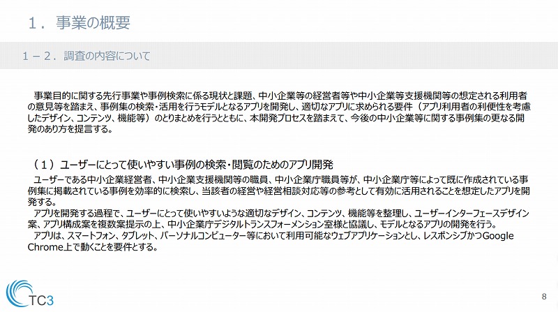 そのため、当該事例集を電子化・データ化し一覧性を持たせると同時に、利用者の属性や関心に応じて例を検索・抽出できる適切な事例集の閲覧手法・媒体のあり方について調査を行い、電子化された事例集の閲覧・活用に当たっての課題とその解消方法を明らかにした上で、事例集の検索・閲覧が行いやすいアプリケーション(以下、「アプリ」という。)を試行的に開発し、事例集が中小企業等の経営課題の解決に一層寄与するものとなることが本事業の目的である。