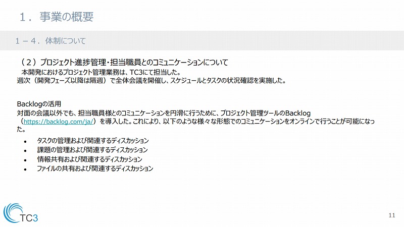 プロジェクト管理ツールのBacklog(https://backlog.com/ja/)を導入した。これにより、以下のような様々な形態でのコミュニケーションをオンラインで行うことが可能になった。