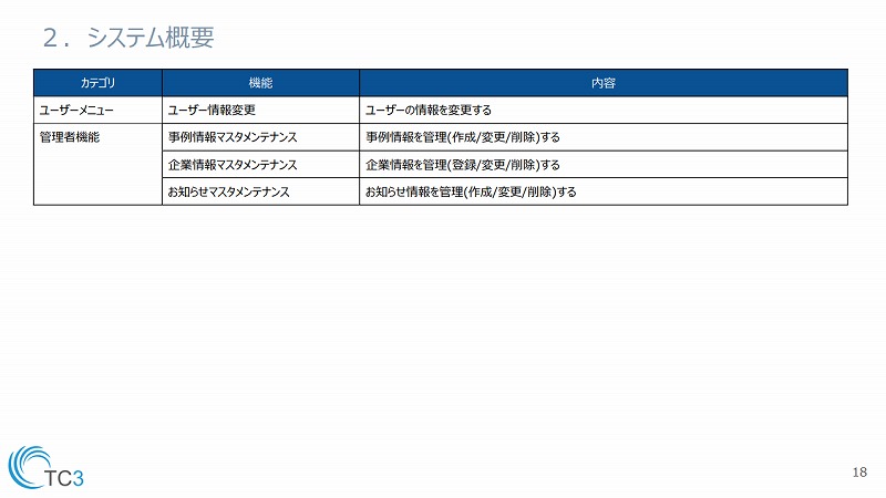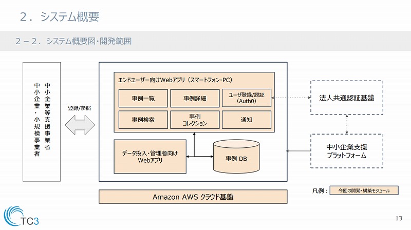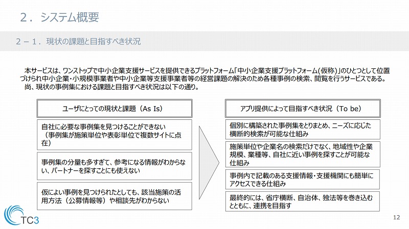 ユーザーは、中小企業経営者、中小企業支援機関等の職員、中小企業庁職員等を想定している。中小企業庁等の事例を効率的に検索し、有効に活用されるアプリを開発する。