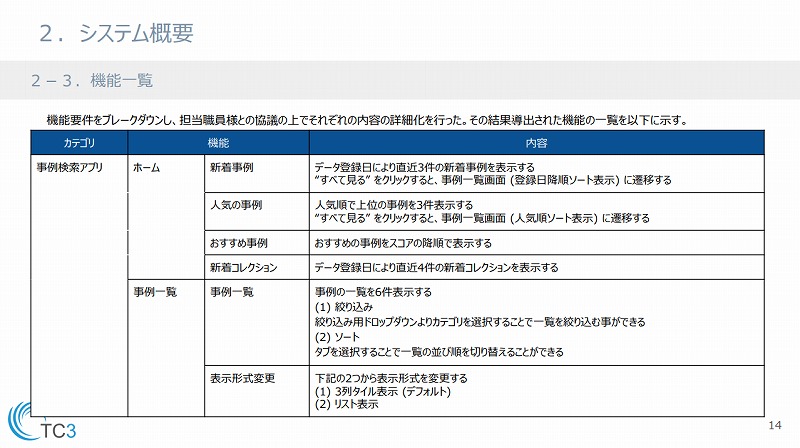 現行の事例集(PDF等)をベースに、事例画面に表示する項目、内容を整理する。また他システム共通の項目(データ)を洗い出し、データ構造、設定値を明確化する。システム化するにあたって、重要視する機能における仕様を検討する。