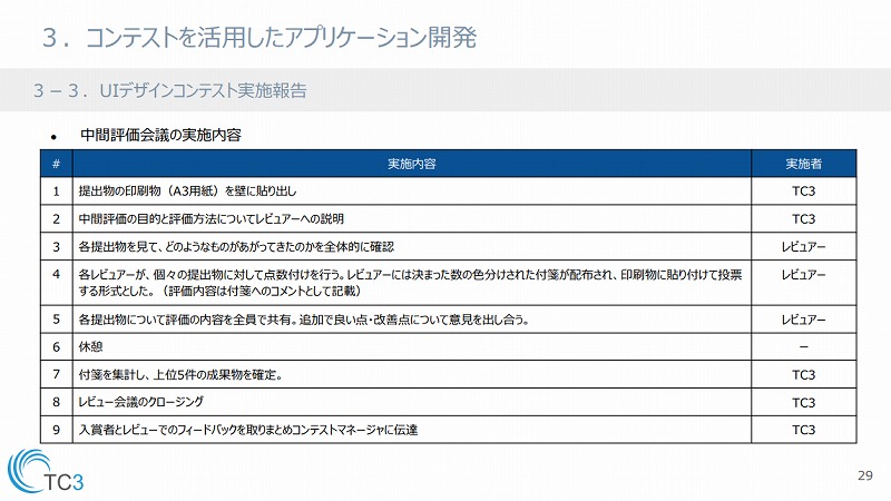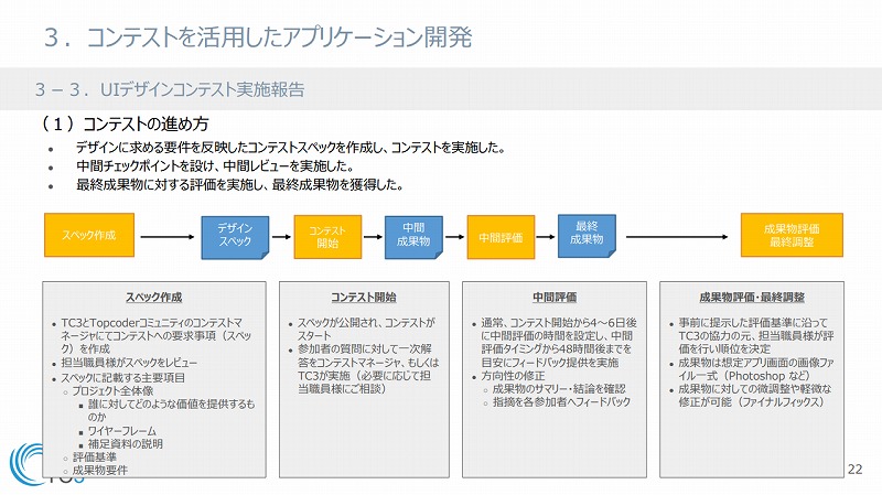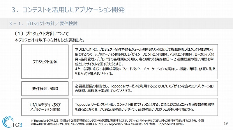 必要最低限の検討とし、Topcoderサービスを利用することで、UI/UXデザインを含めたアプリケーションの整理、具現化を実施していくこととする。