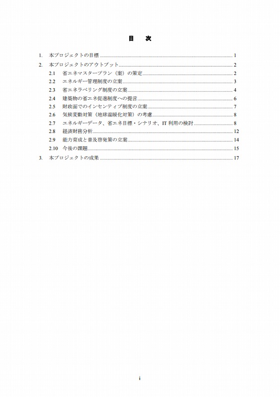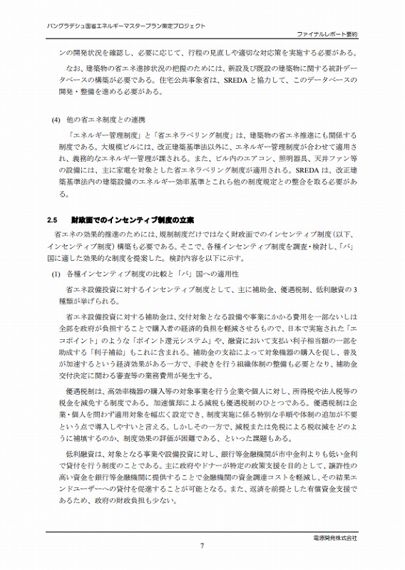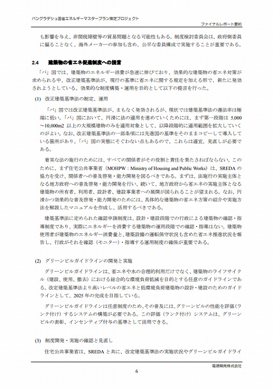 「バ」国では、建築物のエネルギー消費が急速に伸びており、効果的な建築物の省エネ対策が求められる中、改正建築基準法が、現行の基準に省エネに関する規定を加える形で、新たに発効されようとしている。効果的な制度構築・運用を目的として以下の提言を行った。