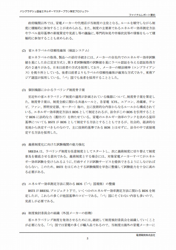 「バ」国では、1次エネルギーの約30%が家庭で消費されているが、その多くが家電製品の使用によるものであり、省エネラベリング制度は、家庭部門の省エネに非常に有効である。SREDAは国の施策として省エネラベリング制度を導入することを決定した。制度の効率的導入を図るため、「省エネラべリング制度骨子案」をまとめた。この制度骨子は関連法令策定の基礎となる。