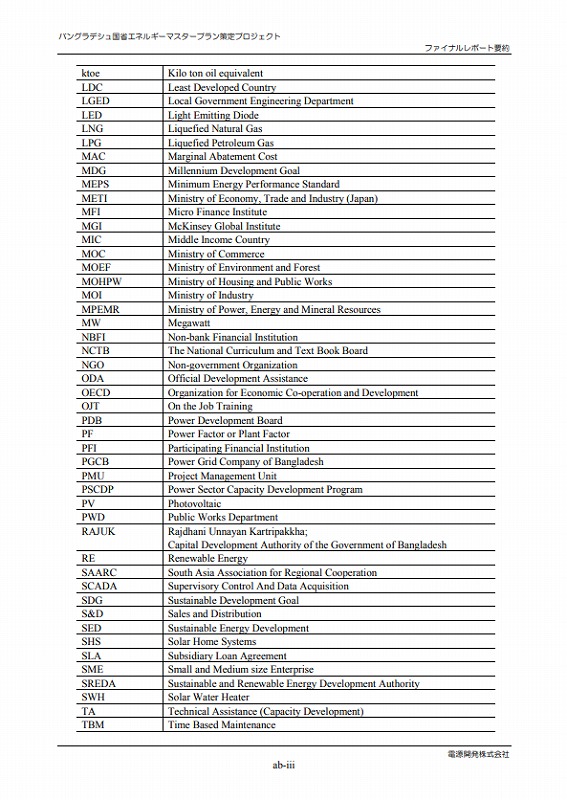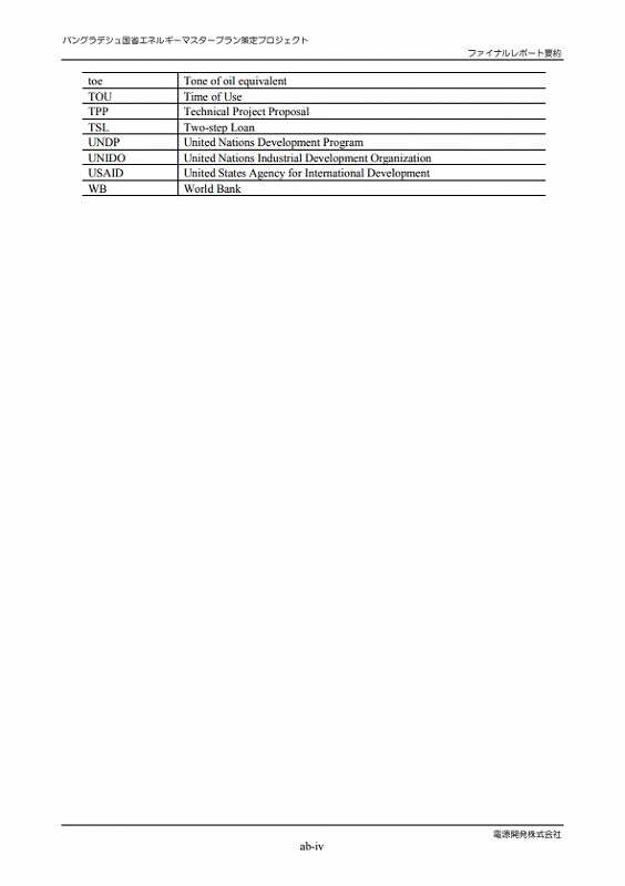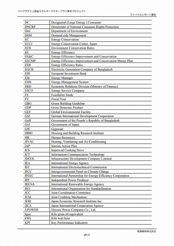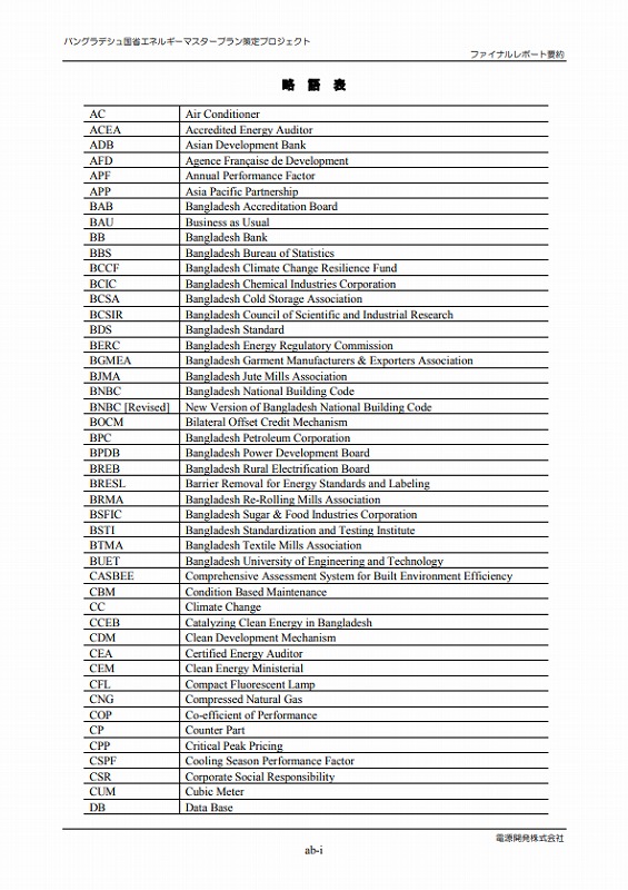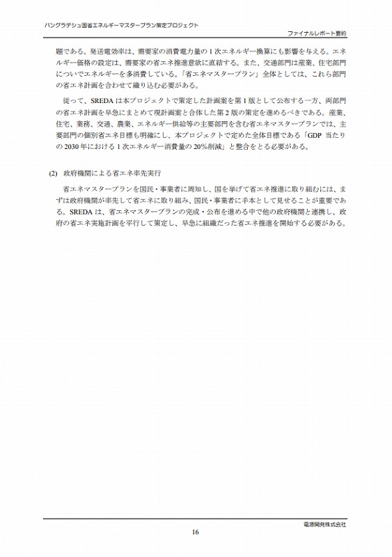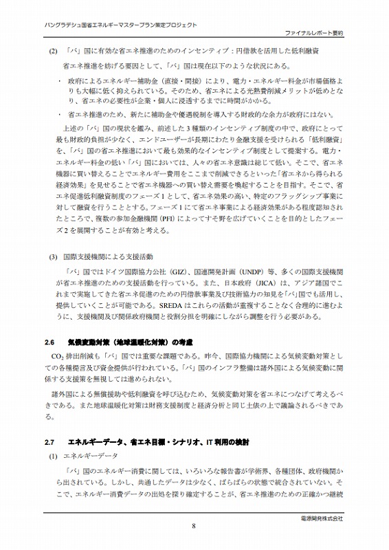 バングラデシュ(以下「バ」国)政府は、増加し続けるエネルギー需要に対して、供給力を高めるのみならず、気候変動対策の視点も踏まえ、省エネルギー(以下「省エネ」)推進が重要であることを認識している。
