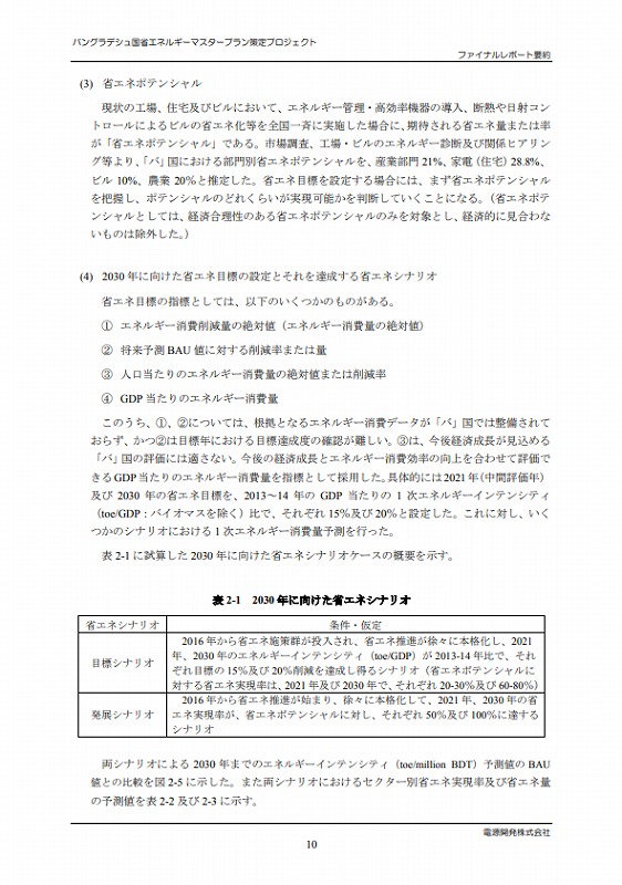 現状の工場、住宅及びビルにおいて、エネルギー管理・高効率機器の導入、断熱や日射コントロールによるビルの省エネ化等を全国一斉に実施した場合に、期待される省エネ量または率が「省エネポテンシャル」である。市場調査、工場・ビルのエネルギー診断及び関係ヒアリング等より、「バ」国における部門別省エネポテンシャルを、産業部門 21%、家電(住宅)28.8%、ビル10%、農業20%と推定した。省エネ目標を設定する場合には、まず省エネポテンシャルを把握し、ポテンシャルのどれくらいが実現可能かを判断していくことになる。(省エネポテンシャルとしては、経済合理性のある省エネポテンシャルのみを対象とし、経済的に見合わな