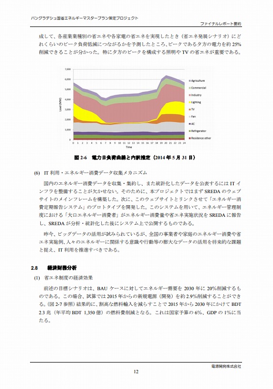 成して、各産業業種別の省エネや各家電の省エネを実現したとき(省エネ発展シナリオ)にどれくらいのピーク負荷低減につながるかを予測したところ、ピークである夕方の電力を約25%削減できることが分かった。特に夕方のピークを構成する照明やTVの省エネが重要である。
