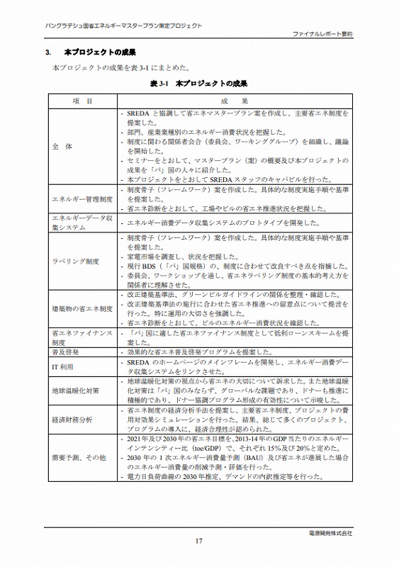 この観点から2014年1月に「バ」国政府は「省エネルギーマスタープラン策定プロジェクト」の実施を宣言し、2015年3月までに以下に記載する4つの成果を取りまとめることとした。