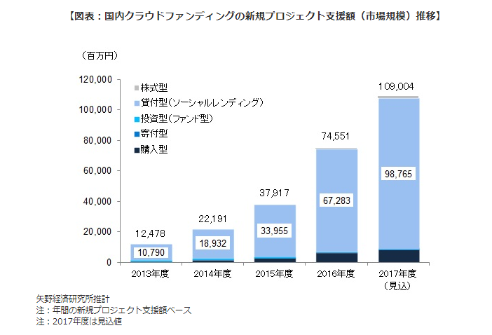 一般的には金融サービスと情報技術を結びつけた動き全般を意味し、資金の貸し手と借り手がインターネット上で直接つながるクラウドファンディングやスマホによる決済、ビットコインなどもフィンテックの一種です。ちなみにクラウドファンディングは群衆(crowd)と資金調達(funding)を組み合わせた造語です。2017年9月13日、海外のクラウドファンディング大手のKickstarterが日本のクリエイター向けにサービスをスタートさせ、クラウドファンディング全体の年々取扱高は増えています。