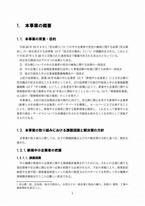 本事業は、上記の改正法案成立後の執行に向けて、官公需に関心を有する新規中小企業者(創業10年未満の中小企業者)のデータベースを構築し、ホームページ上で公表することにより、国等に対し、新規中小企業者に関する最新情報を提供し、これをもって新規中小企業者の商品・サービスについて公共調達がなされる可能性を高めることを目的として実施するものである。
