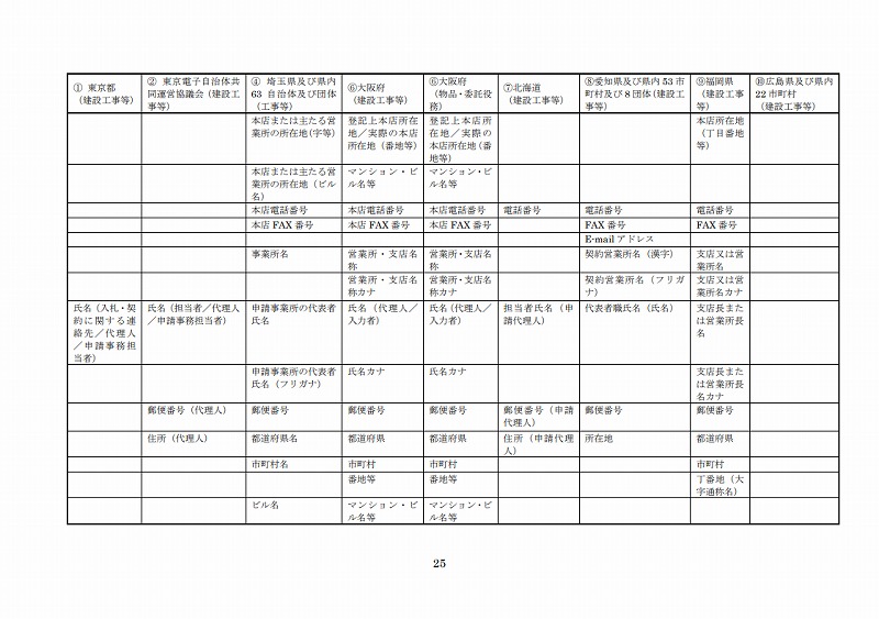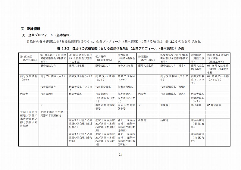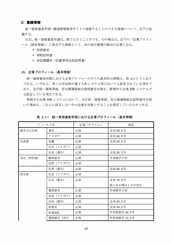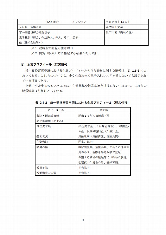 統一資格審査申請における企業プロフィールのうち基本的な情報は、表2.1-1のとおりである。いずれも、多くの自治体の電子入札システム等においても設定されている項目であり、全庁統一資格等級、官公需適格組合証明番号を除き、新規中小企業DBシステムでも設定している項目である。