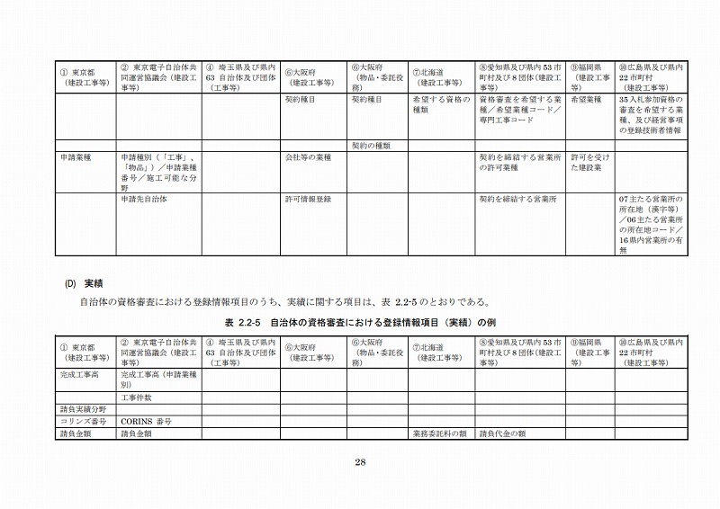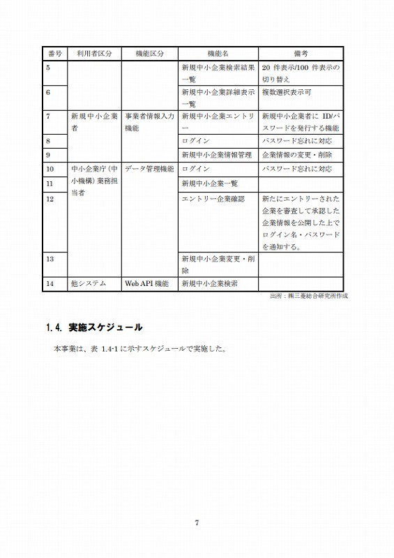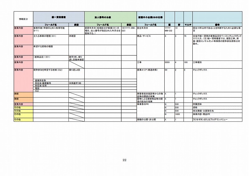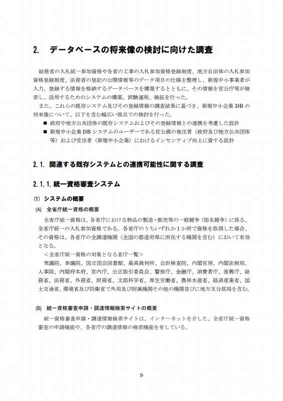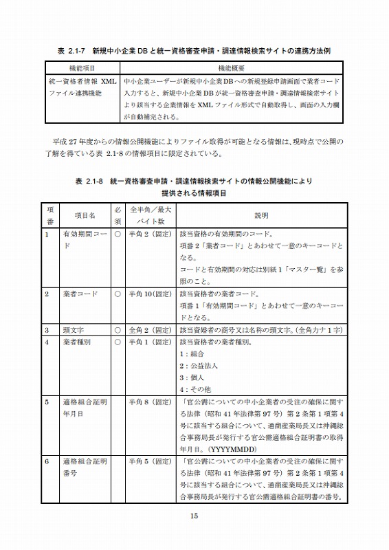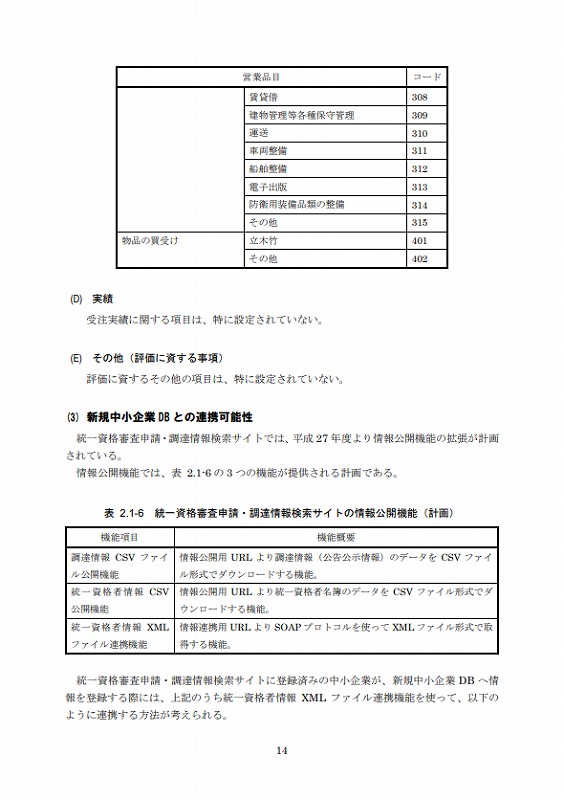 従って、今年度は上記2制度及び地方公共団体の入札参加資格登録制度について調査し、登録に必要な情報のうち共通する項目、必須な項目及びそれらの形式等について調査の上、新規中小企業者のデータ標準仕様を取り纏め、それに基づいて新規中小企業DBを設計・構築した。