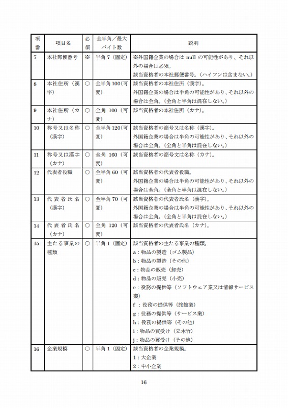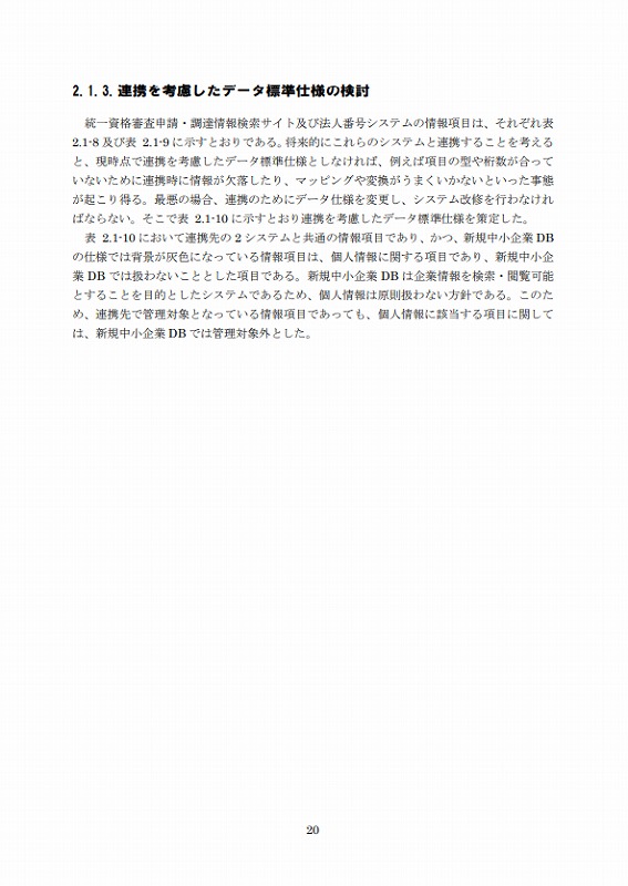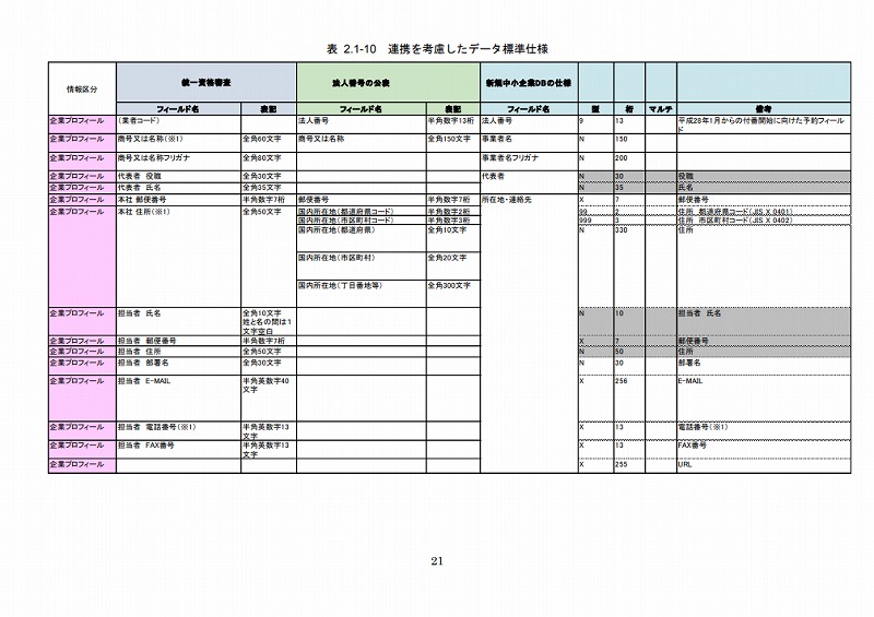統一資格審査申請・調達情報検索サイト及び法人番号システムの情報項目は、それぞれ表2.1-8及び表2.1-9に示すとおりである。将来的にこれらのシステムと連携することを考えると、現時点で連携を考慮したデータ標準仕様としなければ、例えば項目の型や桁数が合っていないために連携時に情報が欠落したり、マッピングや変換がうまくいかないといった事態が起こり得る。