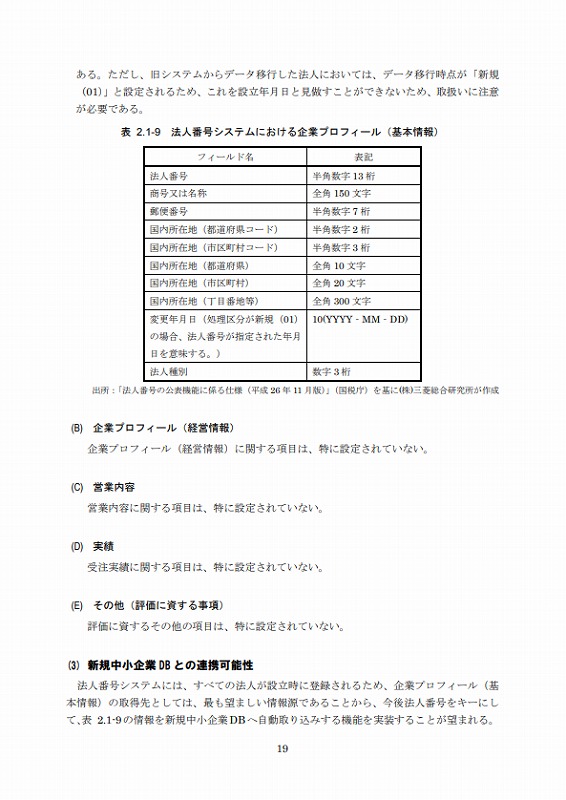 法人番号システムには、すべての法人が設立時に登録されるため、企業プロフィール(基本情報)の取得先としては、最も望ましい情報源であることから、今後法人番号をキーにして、表2.1-9の情報を新規中小企業DBへ自動取り込みする機能を実装することが望まれる。