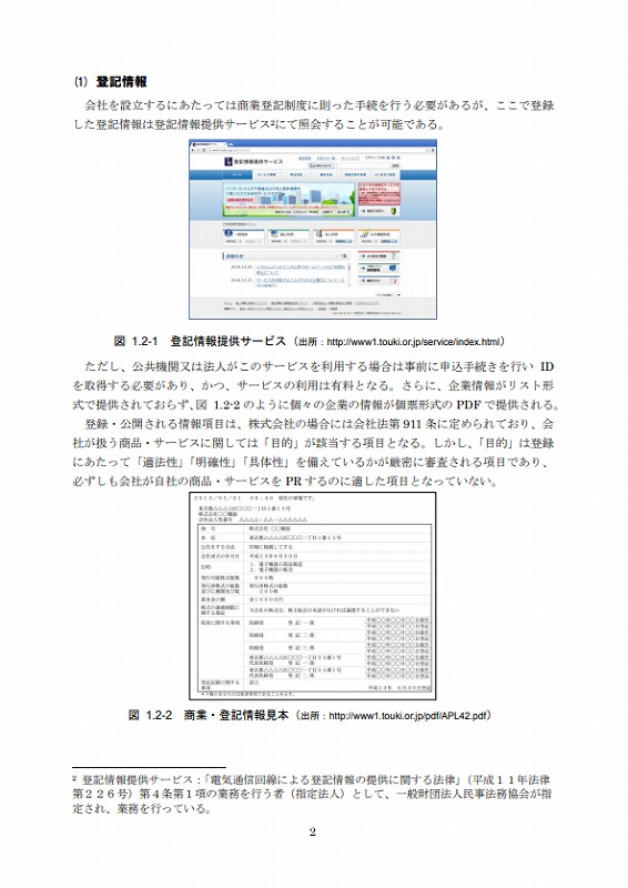 さらに、企業情報がリスト形式で提供されておらず、図 1.2-2 のように個々の企業の情報が個票形式のPDFで提供される。登録・公開される情報項目は、株式会社の場合には会社法第 911 条に定められており、会社が扱う商品・サービスに関しては「目的」が該当する項目となる。しかし、「目的」は登録にあたって「適法性」「明確性」「具体性」を備えているかが厳密に審査される項目であり、必ずしも会社が自社の商品・サービスをPRするのに適した項目となっていない。