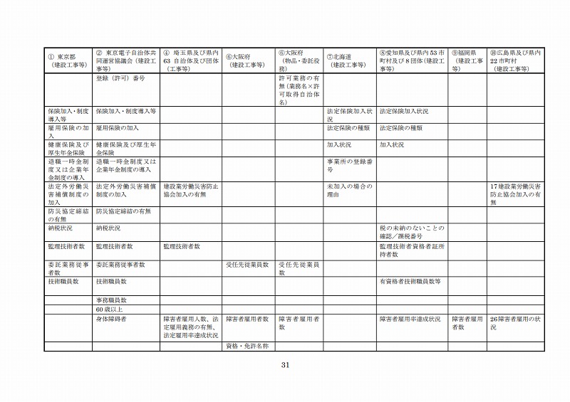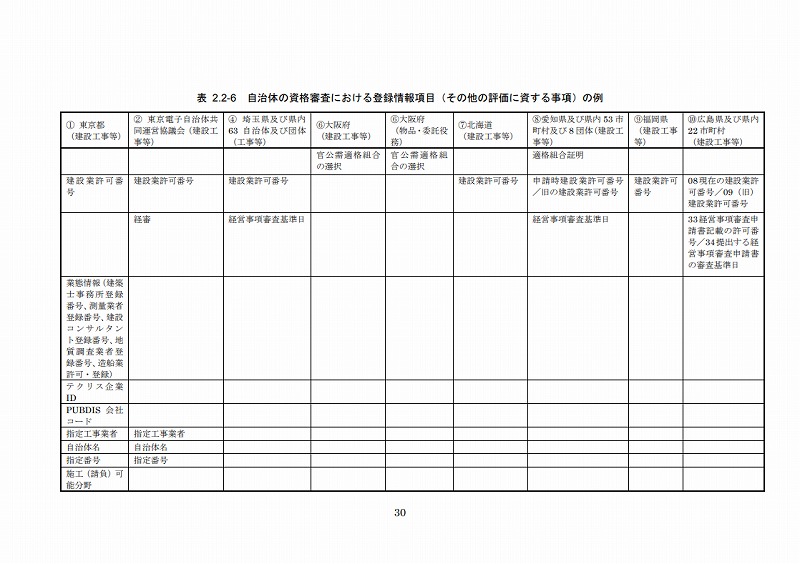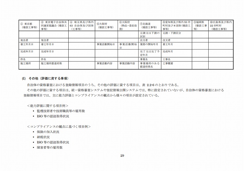 自治体の資格審査における登録情報項目のうち、その他の評価に資する項目は、表2.2-6のとおりである。その他の評価に資する項目は、統一資格審査システムや登記情報公開システムでは、特に設定されていないが、自治体の資格審査における登録情報項目では、主に能力評価とコンプライアンスの観点から様々の項目が設定されている。