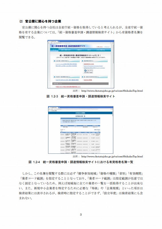 官公需に関心を持つ会社は全省庁統一資格を取得していると考えられるが、全省庁統一資格を有する企業については、「統一資格審査申請・調達情報検索サイト」から有資格者名簿を閲覧できる。