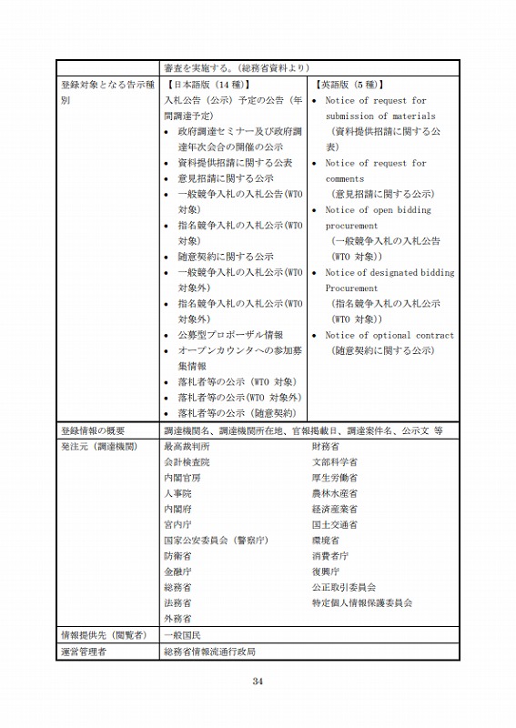 国・独立行政法人及び地方公共団体等(以下、「発注機関」という。)がホームページ上に掲載している入札情報。ただし、都道府県、市町村の入札情報で、当該自治体の HP 内に入札情報の検索サービスがある場合はこの入札情報を除く