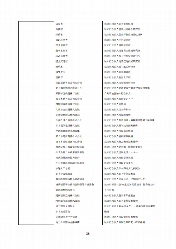 北海道旅客鉄道株式会社、東日本旅客鉄道株式会社、東海旅客鉄道株式会社、西日本旅客鉄道株式会社、四国旅客鉄道株式会社、九州旅客鉄道株式会社、日本貨物鉄道株式会社、日本たばこ産業株式会社、日本電信電話株式会社、沖縄振興開発金融公庫、東日本電信電話株式会社、西日本電信電話株式会社、株式会社日本政策金融公庫、株式会社日本政策投資銀行、株式会社国際協力銀行、社会保険診療報酬支払基金、放送大学学園、日本中央競馬会、農林漁業団体職員共済組合、消防団員等公務災害補償等共済基金、電源開発株式会社、関西国際空港株式会社、国際電信電話株式会社、地方競馬全国協会、日本放送協会、日本勤労者住宅協会、地方公共団体金融機構、日本私立学校振興・共済事業団、日本郵政公社、成田国際空港株式会社、日本環境安全事業株式会社、東京地下鉄株式会社、国立大学法人、大学共同利用機関法人、東日本高速道路株式会社、中日本高速道路株式会社、西日本高速道路株式会社、首都高速道路株式会社、阪神高速道路株式会社、本州四国連絡高速道路株式会社、日本アルコール産業株式会社、株式会社商工組合中央金庫、全国健康保険協会、日本年金機構、日本財団、新関西国際空港株式会社