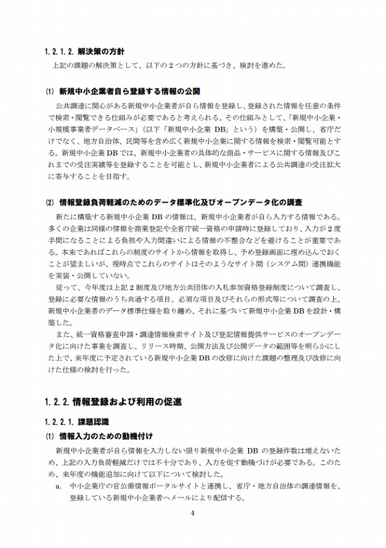 新規中小企業DBでは、新規中小企業者の具体的な商品・サービスに関する情報及びこれまでの受注実績等を登録することを可能とし、新規中小企業者による公共調達の受注拡大に寄与することを目指す。