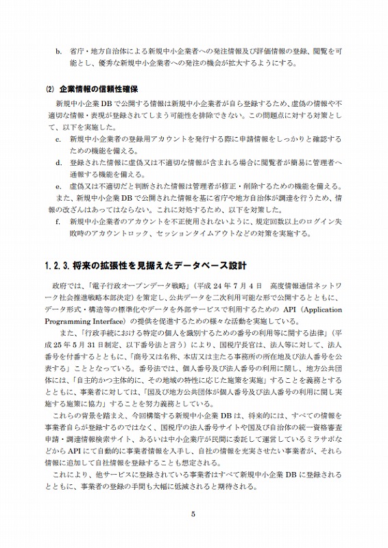 これらの背景を踏まえ、今回構築する新規中小企業DBは、将来的には、すべての情報を事業者自らが登録するのではなく、国税庁の法人番号サイトや国及び自治体の統一資格審査申請・調達情報検索サイト、あるいは中小企業庁が民間に委託して運営しているミラサポなどから API にて自動的に事業者情報を入手し、自社の情報を充実させたい事業者が、それら情報に追加して自社情報を登録することも想定される。