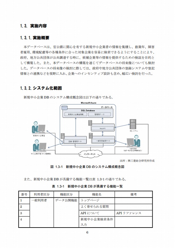 本データベースは、官公需に関心を有する新規中小企業者の情報を集積し、創業年、障害者雇用、環境配慮等の各種条件に合った対象企業を容易に検索できるようにすることにより、政府、地方公共団体が公共調達する時に、候補企業等の情報を提供するための検証を目的として構築した。