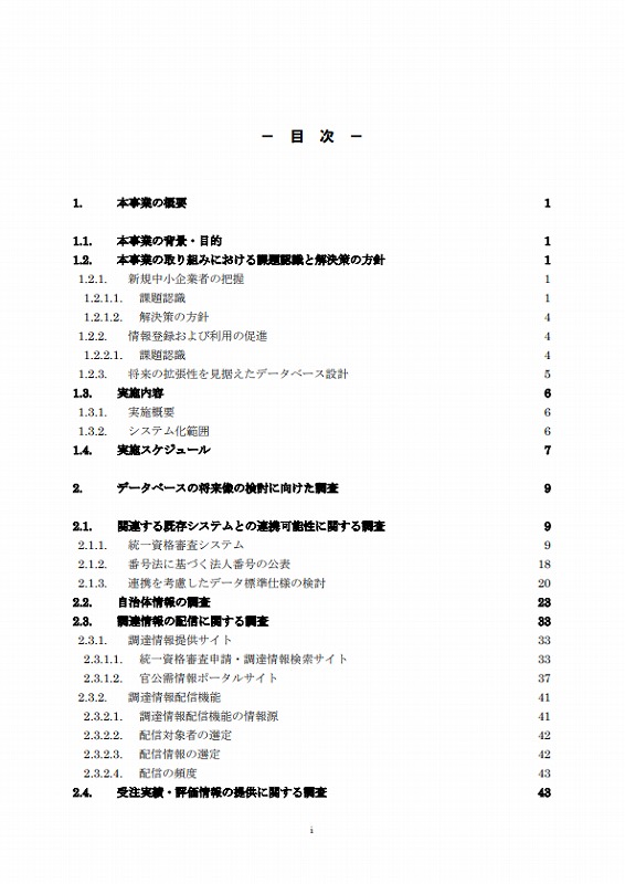 また、統一資格審査申請・調達情報検索サイト及び登記情報提供サービスのオープンデータ化に向けた事業を調査し、リリース時期、公開方法及び公開データの範囲等を明らかにした上で、来年度に予定されている新規中小企業DBの改修に向けた課題の整理及び改修に向けた仕様の検討を行った。