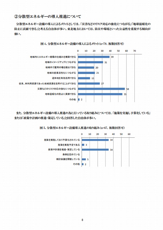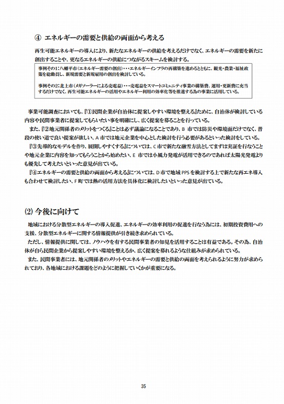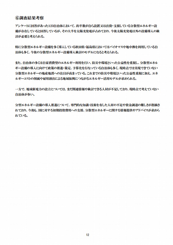 アンケートによる課題・取組手法の洗い出しや自治体における導入可能性調査など、各論がかなり詳細に報告されています。今後の日本におけるエネルギー供給システムのあり方について、参考になるヒントが満載です。