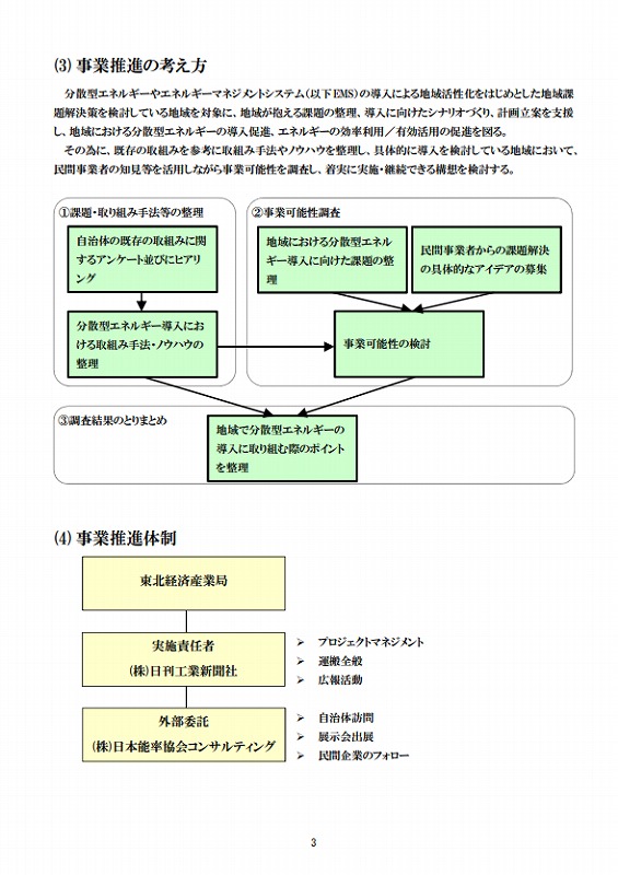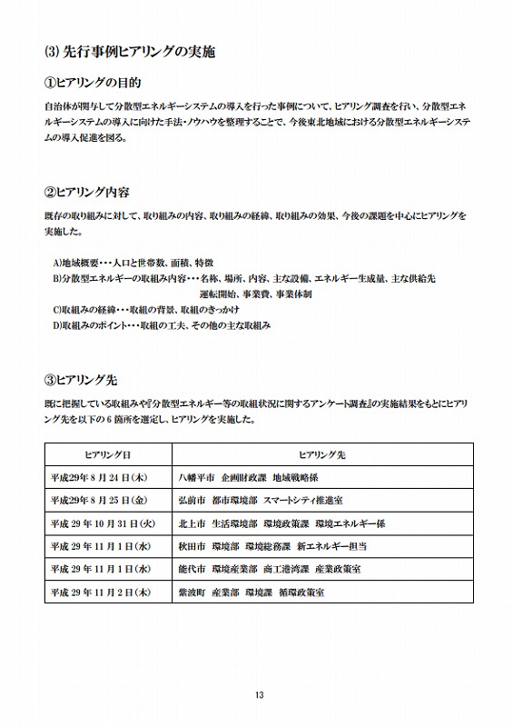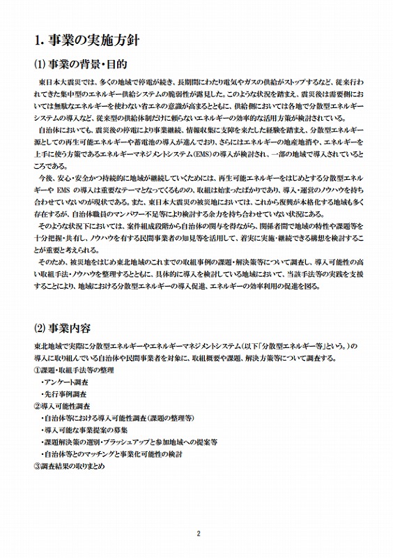 東北地域で実際に分散型エネルギーやエネルギーマネジメントシステム(以下「分散型エネルギー等」という。)の導入に取り組んでいる自治体や民間事業者を対象に、取組概要や課題、解決方策等について調査する。