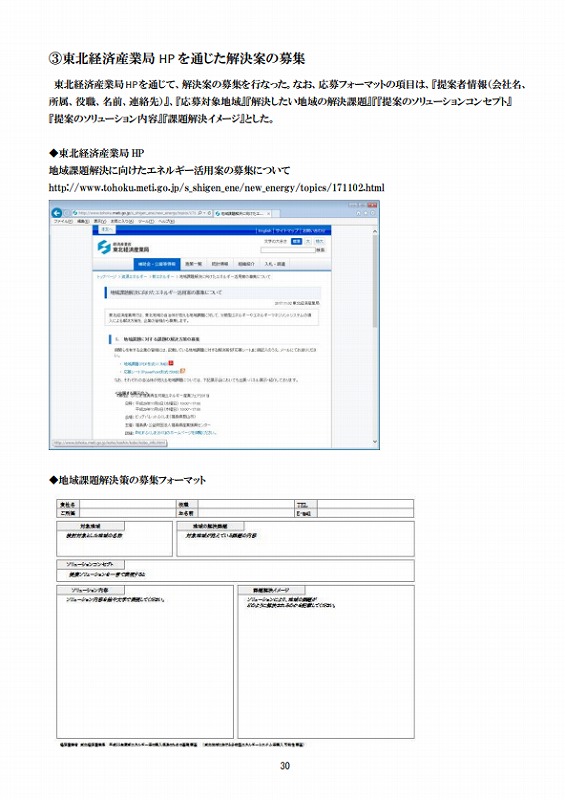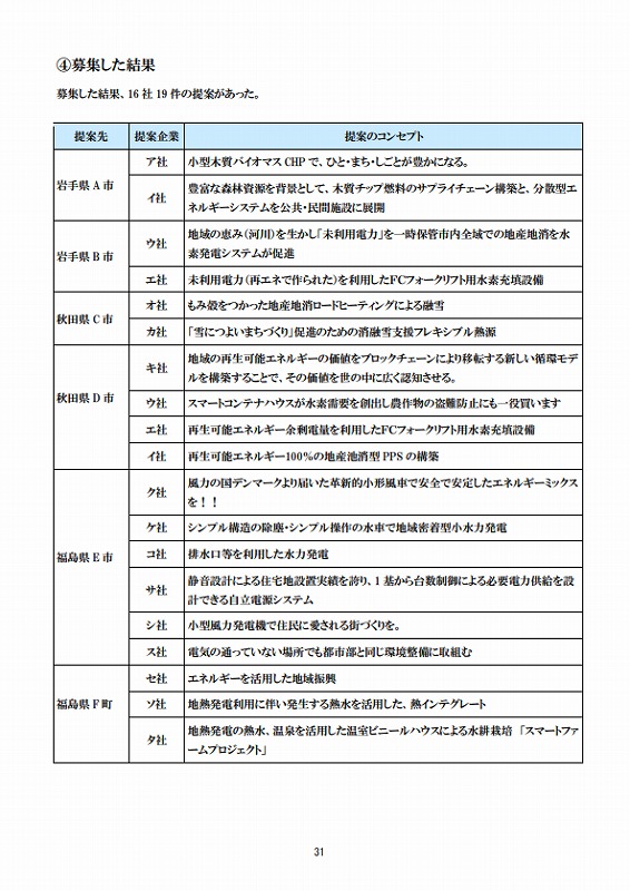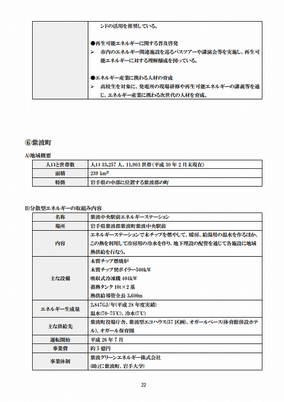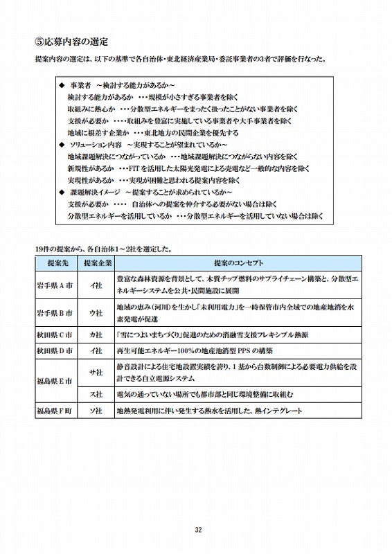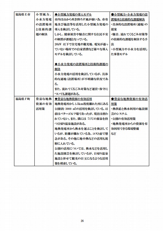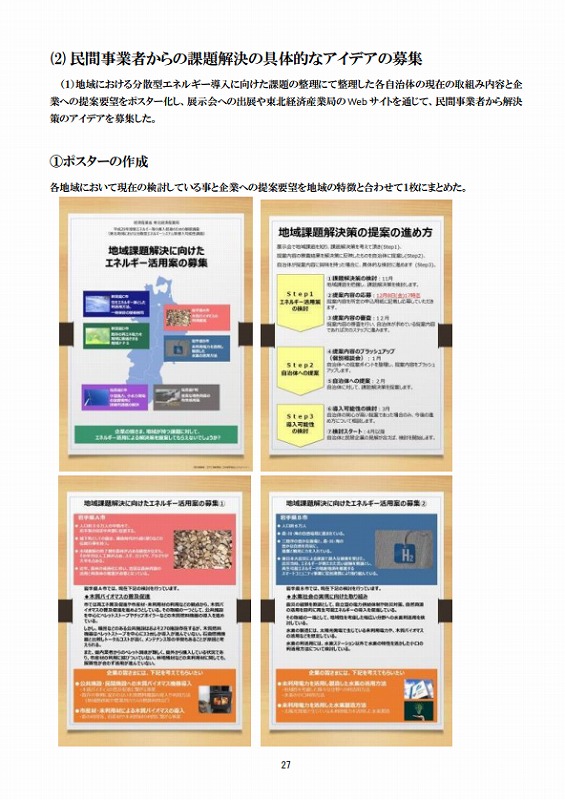 そのため、被災地をはじめ東北地域のこれまでの取組事例の課題・解決策等について調査し、導入可能性の高い取組手法・ノウハウを整理するとともに、具体的に導入を検討している地域において、当該手法等の実践を支援することにより、地域における分散型エネルギーの導入促進、エネルギーの効率利用の促進を図る。