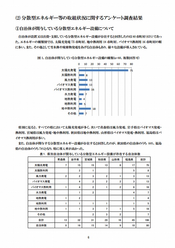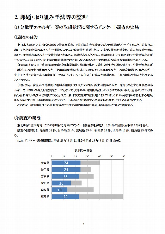 東北6県の全市町村、225の市町村を対象にアンケート調査票を郵送し、123件の回答(回収率55%)を得た。県別の回答数は、青森県24件、岩手県24件、宮城県23件、秋田県16件、山形県13件、福島県23件である。なお、アンケート調査期間は、平成29年8月22日から平成29年9月15日である。