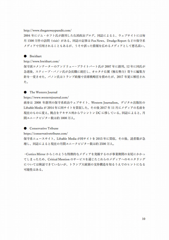 ・すなわち「The Gateway Pundit」、「Breitbart」、「Conservative Tribune」といったメディアである。本調査の中で⽶メディアを最前線でモニタリングしてきた受託者の外注者のひとりは「トップページのヘッドラインを⾒るだけで、怪しいサイトだと想像できる。3つのメディアの名前で検索すると、うそや誤った情報をまき散らすサイトという説明が続々出てくる」との評価。加えて「Western Journalism」というメディアの情報源としての登場頻度も⾼い。