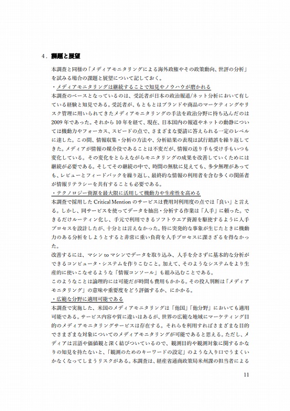 それらを利⽤すればさまざまな⽬的でさまざまな対象についてのメディアモニタリングが可能であると思える。ただし、メディアは⾔語や価値観と深く結びついているので、観測⽬的や観測対象に関するかなりの知⾒を持たないと、「観測のためのキーワードの設定」のような⼊り⼝でうまくいかなくなってしまうリスクがある。本調査は、経産省通商政策局⽶州課の担当者による深い⾒識に基づいた助⾔の数々がなければ成⽴していない。