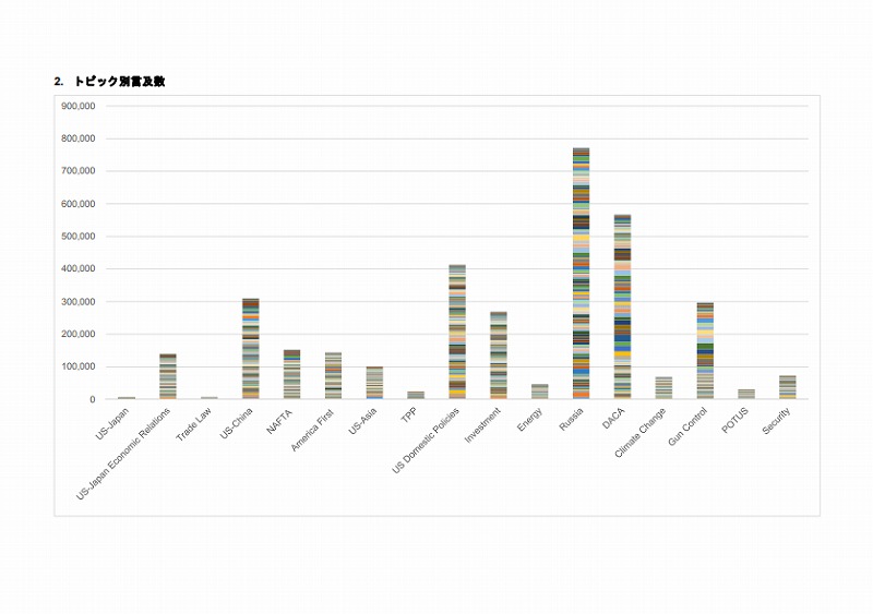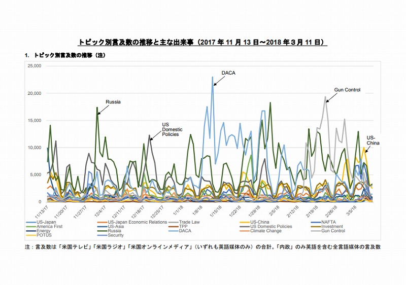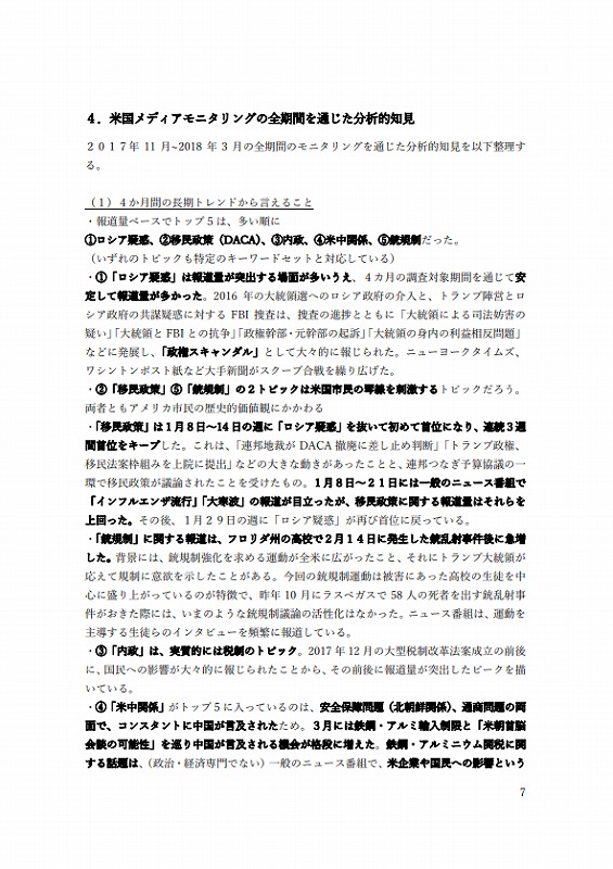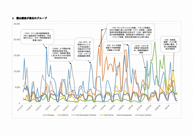 ・報道量ベースでトップ5は、多い順に①ロシア疑惑、②移⺠政策(DACA)、③内政、④⽶中関係、⑤銃規制だった。
