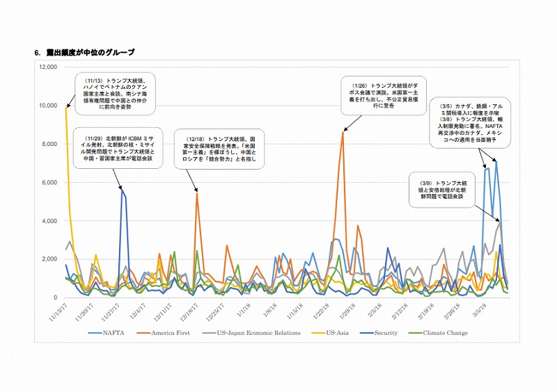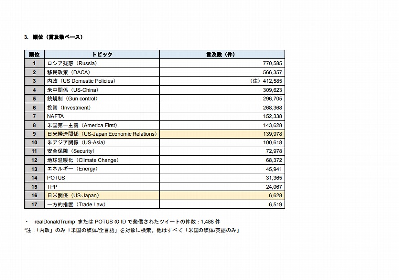 このため期間中は、トランプ大統領自身のTwitter名として知られている「real Donald Trump」または「POTUS」から発信されたツイートの件数を観測し、あるいは同Twitter名を含む記事を検索対象としたが、明確な分析の対象となるような素材が得られなかった。