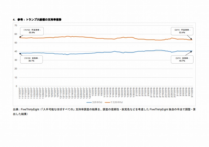 ・ただし、トランプ⼤統領就任(2017年1⽉20 ⽇)から2018年3⽉までの⽀持率推移をみると、⽀持率は徐々に低下し、不⽀持率は10ポイント以上上昇している。