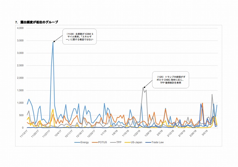 -ミクロ事象を観察するには、例えば「US-Japan Economic Relations」で抽出された結果をさらに、特定の通商語彙(TPPなど)や、特定の組織名あるいは個⼈名などつかってさらに絞りこんでいくことで論理的には可能。しかし、定常的に深掘りするのは作業負荷に対する情報獲得利益が極めて⼩さいと思われるので、特定の突発事象が起きたときに集中して調べるのがよさそうである。