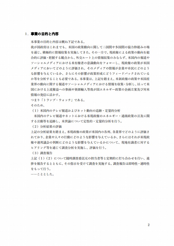 本事業は、上記を踏まえ、⽶新政権の政策や⽶国産業界の動向に関する報道やソーシャルメディアにおける情報を収集・分析し、以って⽶国における上流権益への参画や資源輸⼊等我が国エネルギー政策の企画⽴案及び対⽶情報の発信に活かす。つまり「トランプ・ウォッチ」である。