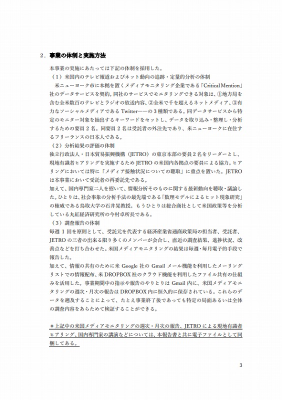 ⽶ニューヨーク市に本拠を置くメディアモニタリング企業である「Critical Mention」社のデータサービスを契約。同社のサービスでモニタリングできる対象は、①地⽅局を含む全⽶数百のテレビとラジオの放送内容、②全⽶で千を超えるネットメディア、③有⼒なソーシャルメディアである Twitter-―の3種類である。