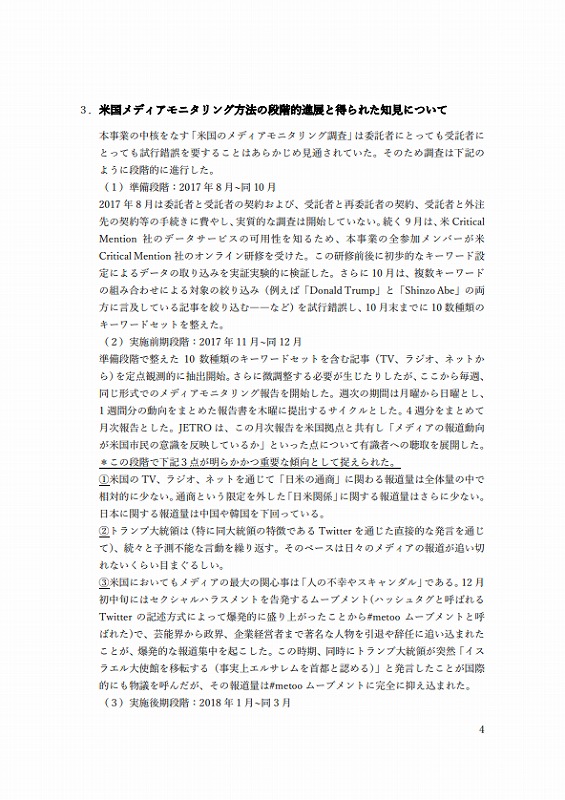 4週分をまとめて⽉次報告とした。JETROは、この⽉次報告を⽶国拠点と共有し「メディアの報道動向が⽶国市⺠の意識を反映しているか」といった点について有識者への聴取を展開した。