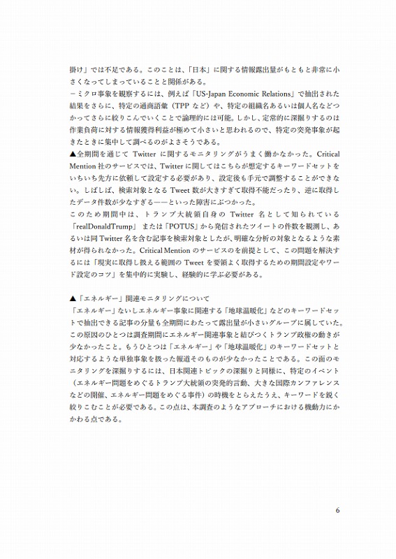 もうひとつは「エネルギー」や「地球温暖化」のキーワードセットと対応するような単独事象を扱った報道そのものが少なかったことである。この⾯のモニタリングを深掘りするには、⽇本関連トピックの深掘りと同様に、特定のイベント(エネルギー問題をめぐるトランプ⼤統領の突発的⾔動、⼤きな国際カンファレンスなどの開催、エネルギー問題をめぐる事件)の時機をとらえたうえ、キーワードを鋭く絞りこむことが必要である。この点は、本調査のようなアプローチにおける機動⼒にかかわる点である。