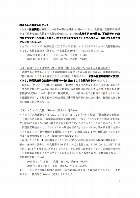 ・トランプ⼤統領の今後を単純なアナロジーで予想するのは安易に過ぎるが、少なくともメディアモニタリングで露わになる様相に反してトランプ⼤統領の⽀持が堅い事実は、同⼤統領のコア⽀持層は、トランプ⽒が何を⾔っても/やっても⽀持を続けている⼈たちと推定できる。