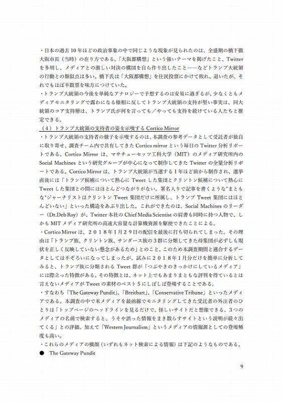 ・トランプ⼤統領の⽀持者の様⼦を⽰唆するのは、本調査の参考データとして受託者が独⾃に取り寄せ、調査チーム内で共有してきたCortico mirrorという毎⽇のTwitter分析リポートである。Cortico Mirrorは、マサチューセッツ⼯科⼤学(MIT)のメディア研究所内のSocial Machines という研究グループが中⼼になって制作してきたTwitterの全量分析リポートである。Cortico Mirrorは、トランプ⼤統領が当選する1年ほど前から制作され、選挙直後には「トランプ候補について熱⼼にTweetした集団とクリントン候補について熱⼼にTweetした集団との間にはほとんどつながりがない。