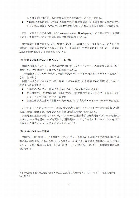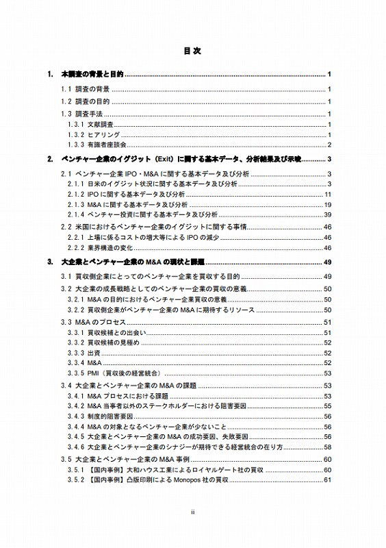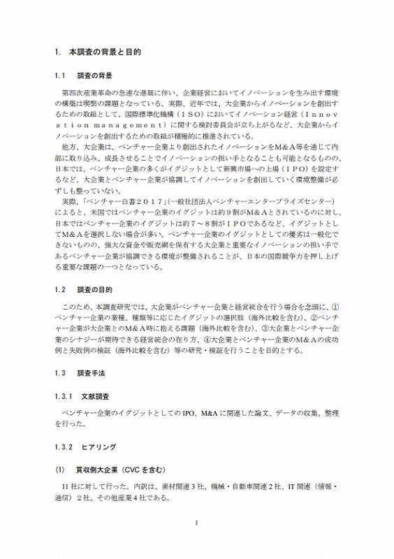 このため、本調査研究では、大企業がベンチャー企業と経営統合を行う場合を念頭に、①ベンチャー企業の業種、種類等に応じたイグジットの選択肢(海外比較を含む)、②ベンチャー企業が大企業とのM&A時に抱える課題(海外比較を含む)、③大企業とベンチャー企業のシナジーが期待できる経営統合の在り方、④大企業とベンチャー企業のM&Aの成功例と失敗例の検証(海外比較を含む)等の研究・検証を行うことを目的とする。