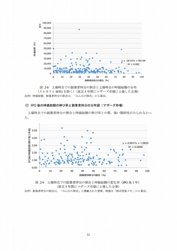 直近5年間(2014~2018年)にマザーズ市場に上場した企業に対し、上場時点での創業者持分の株式の割合と上場時点の時価総額の分布を以下のとおり作成した。なお、メルカリとMTGは、他の会社に比較して上場時点の時価総額が突出的に大きかったため、当該2社のデータを除いた分布図も作成した。いずれの場合においても、上場時点での創業者持分の割合と上場時点の時価総額との間に、関係性はみられなかった。