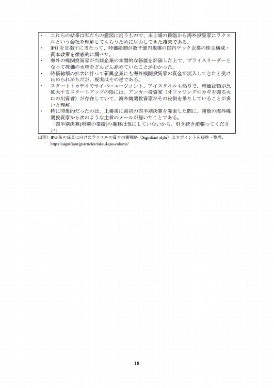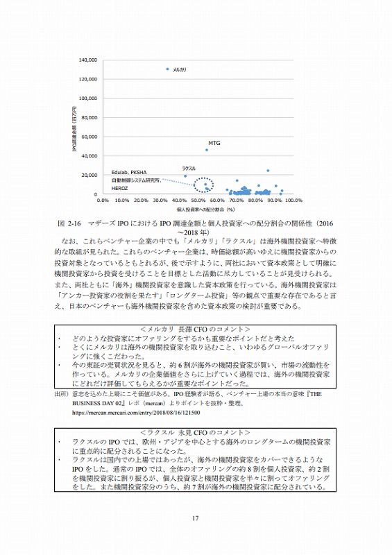 米国では、ベンチャー企業を複数創業した者も多く、そうした人材が流動(転職)するため、その経験値が他のベンチャー企業にも普及していくとみられる。日本はまだそうした状況にはなく、上場に関する経験値がベンチャー企業側で不足している。また、証券市場関係者、投資家を納得させられるCFOが不足している。近年、一部のベンチャー企業では、優れたCFOが存在し、海外の機関投資家とのコミュニケーションを進め、大口の資金調達に成功している。
