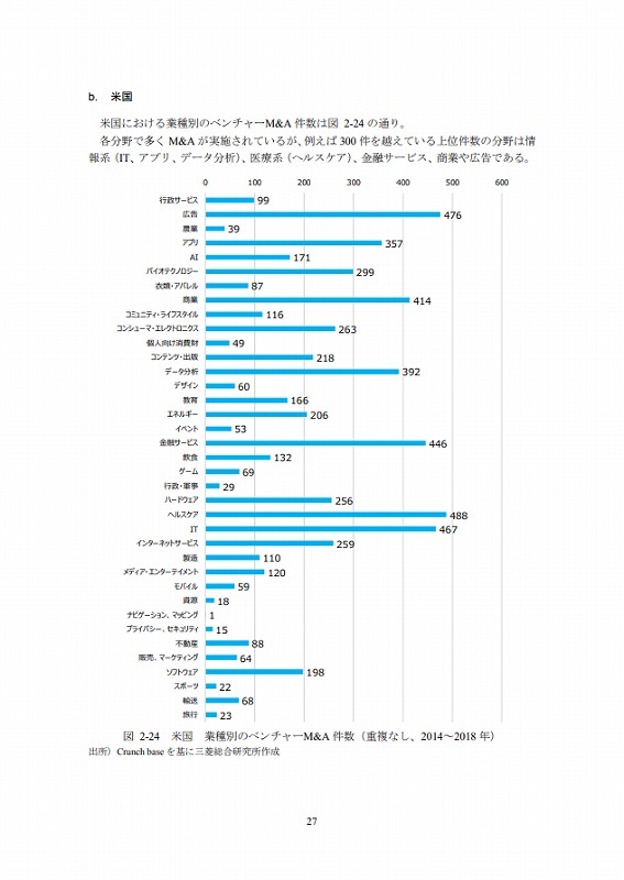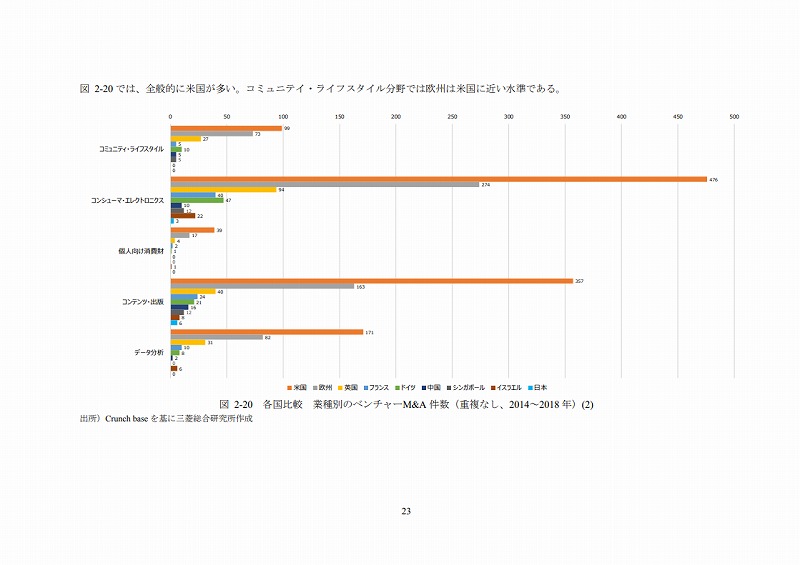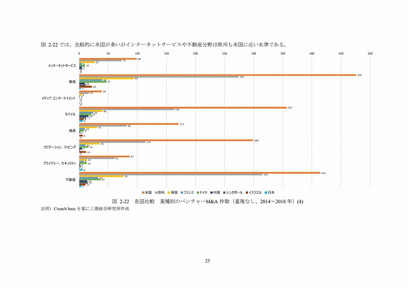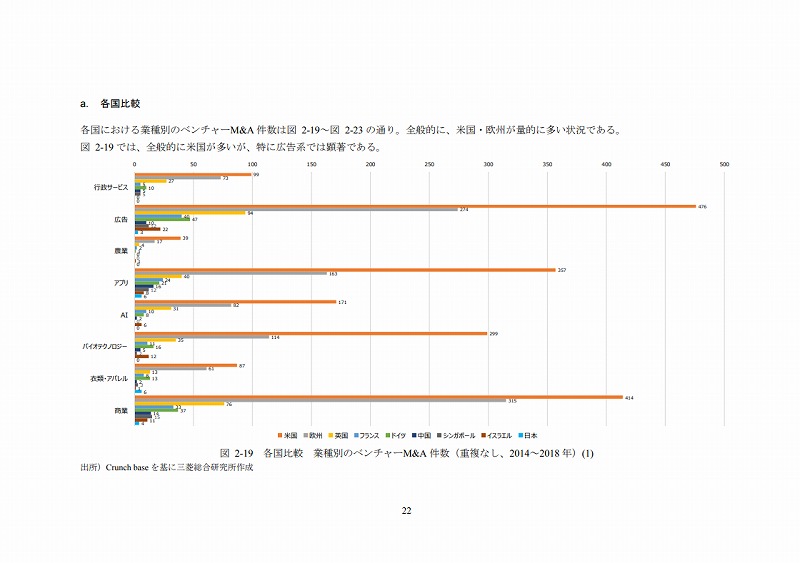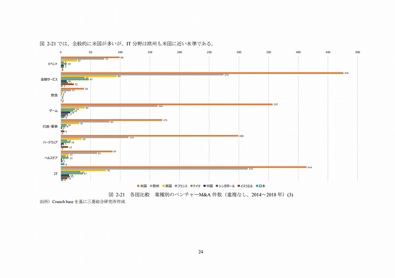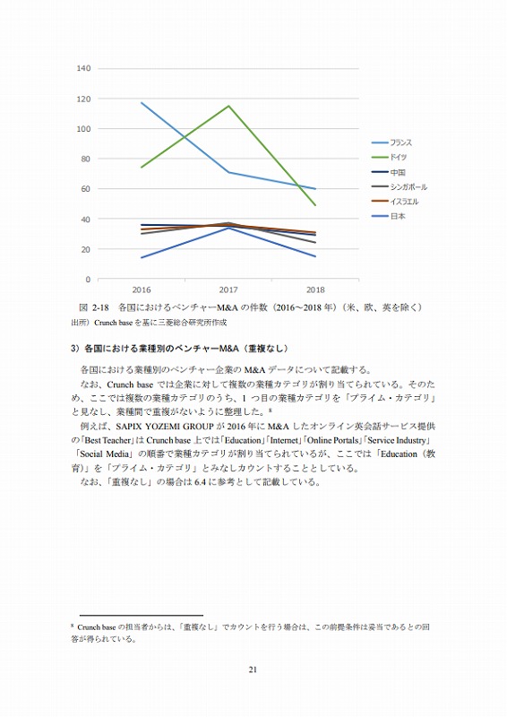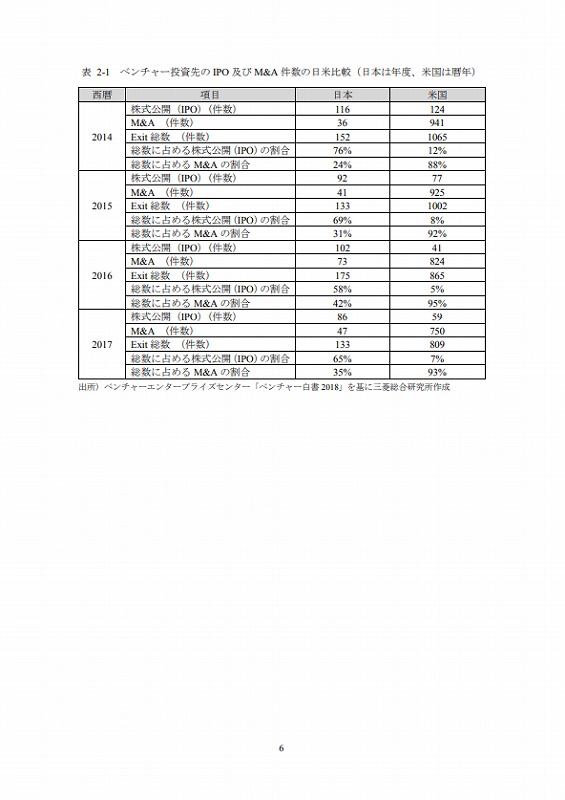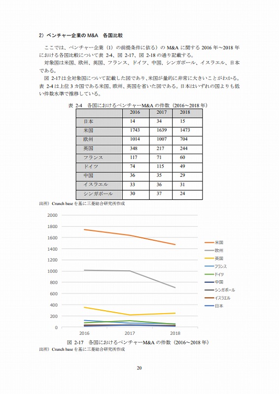 M&Aの件数については、文献ごとにM&Aとしてカウントする対象が異なる等の問題があり、データ間での接続性に課題がある。ここでは既存の文献(ベンチャーエンタープライズセンター「ベンチャー白書2017」)で日米比較のデータが有るためそれを活用しているが、後述するCrunch baseでカウントしたM&A件数とは必ずしも合致していない点は留意されたい。(ただし、数字のオーダー感では大きな差はない。)