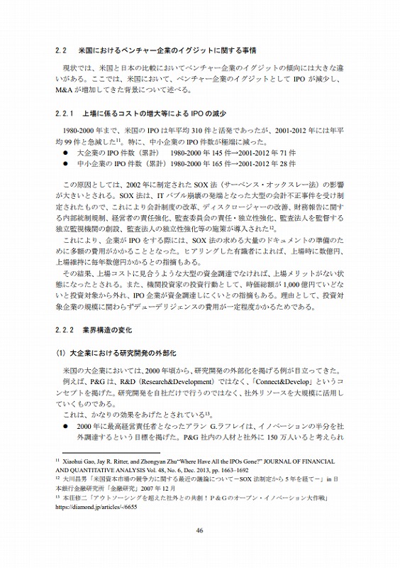 他方、大企業は、ベンチャー企業より創出されたイノベーションをM&A等を通じて内部に取り込み、成長させることでイノベーションの担い手となることも可能となるものの、日本では、ベンチャー企業の多くがイグジットとして新興市場への上場(IPO)を設定するなど、大企業とベンチャー企業が協調してイノベーションを創出していく環境整備が必ずしも整っていない。