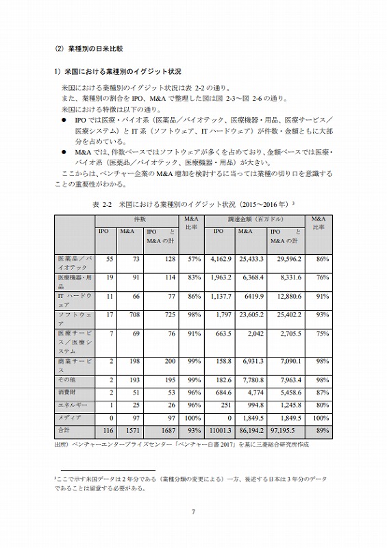 日本における業種別のイグジット状況は表2-3の通り。米国と比較した際の日本における特徴は以下の通り。