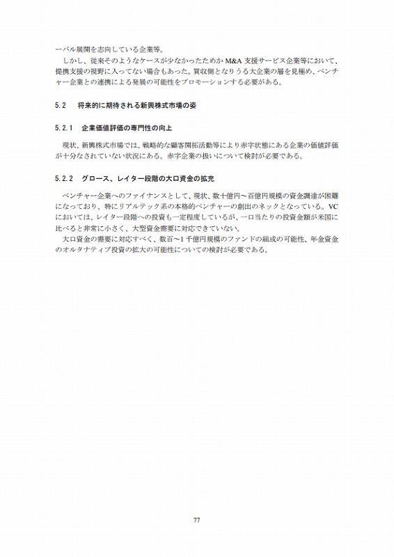 ベンチャー企業へのファイナンスとして、現状、数十億円~百億円規模の資金調達が困難になっており、特にリアルテック系の本格的ベンチャーの創出のネックとなっている。VCにおいては、レイター段階への投資も一定程度しているが、一口当たりの投資金額が米国に比べると非常に小さく、大型資金需要に対応できていない。